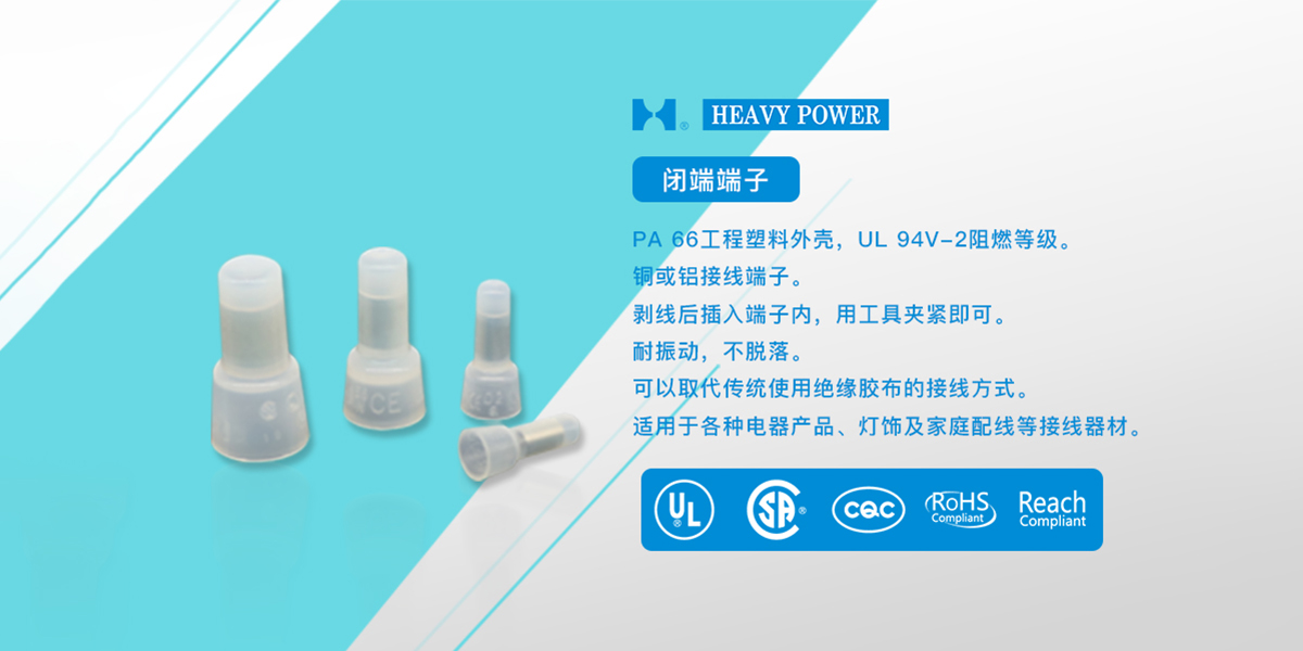 一、閉端端子特點(diǎn)1、PA 66工程塑料外殼,UL 94V-2阻燃等級(jí)。2.銅或鋁接線端子。3.剝線后插入端子內(nèi),用工具夾緊即可。4.耐振動(dòng),不脫落。5.可以取代傳統(tǒng)使用絕緣膠布的接線方式。6.適用于各種電器產(chǎn)品、燈飾及家庭配線等接線器材。